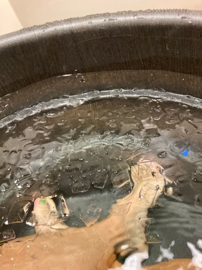 Normally I watch a video of David Goggins talking or something like that. It keeps me distracted from the cold. I decided to go in the opposite direction today and focus on the thoughts running through my head and put them out there into the world. So here it is! I’m cold but calm. I feel myself shivering but then breath and it goes away. My body can handle the cold. I know this because I’ve done this before. We are amazing creatures, humans, we can endure so much but often give into our own weakness because of its convenience or our disbelief.